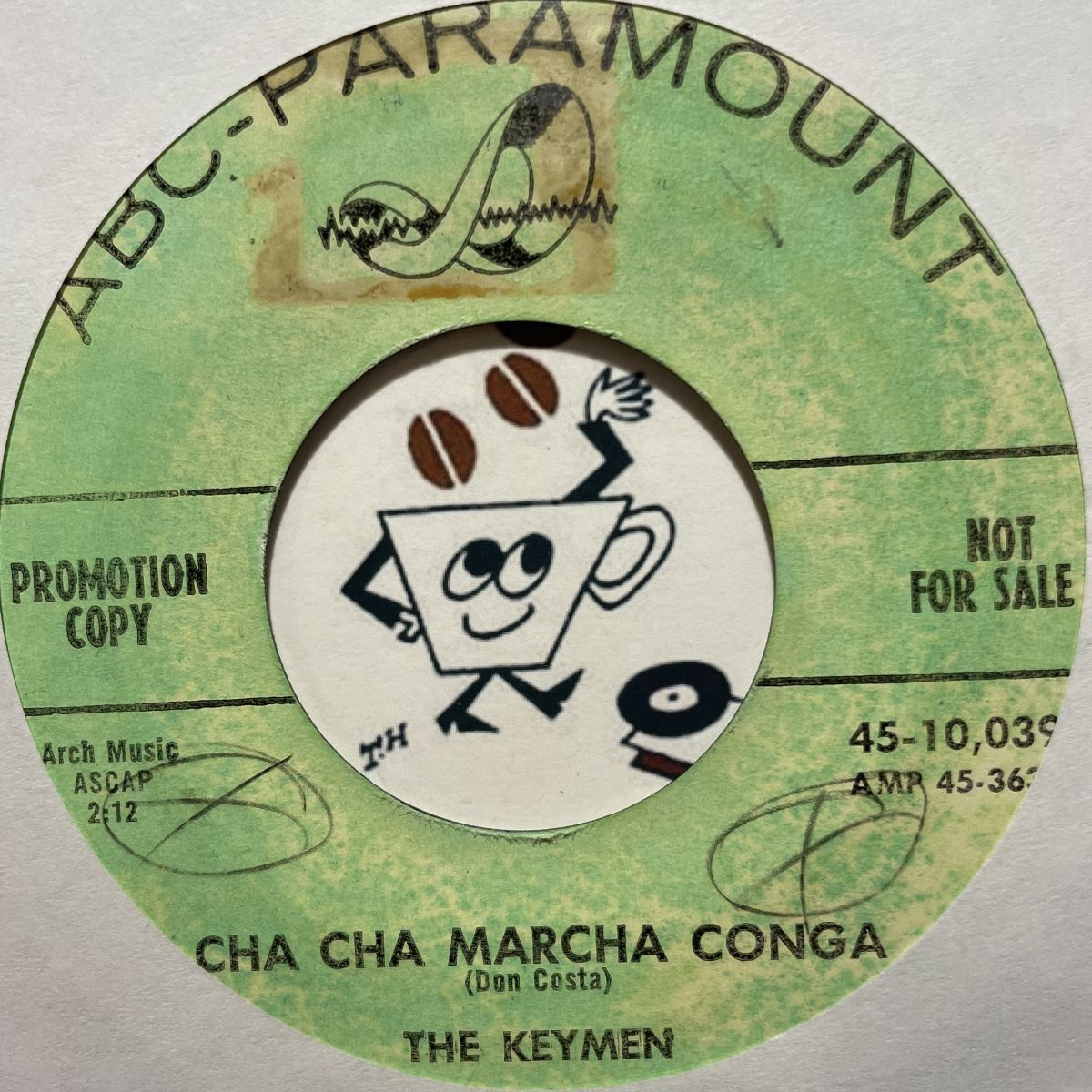 USインストR&RバンドTHE KEYMENの1959年ABCレーベルプロモSEVEN INCシングルCHA CHA MARCHA CONGA。DON COSTA作の軽快かつ切れ味抜群のオーケストラCHACHA-MAMBOで、ゴージャスコーラスと季節感も相まってそれはそれは素敵な響きなのでございます!!!カップリング曲CAMILIAも玄人好みなソフトSURF佳作で共におススメです。ラベルの変色を除けば完璧!!!
