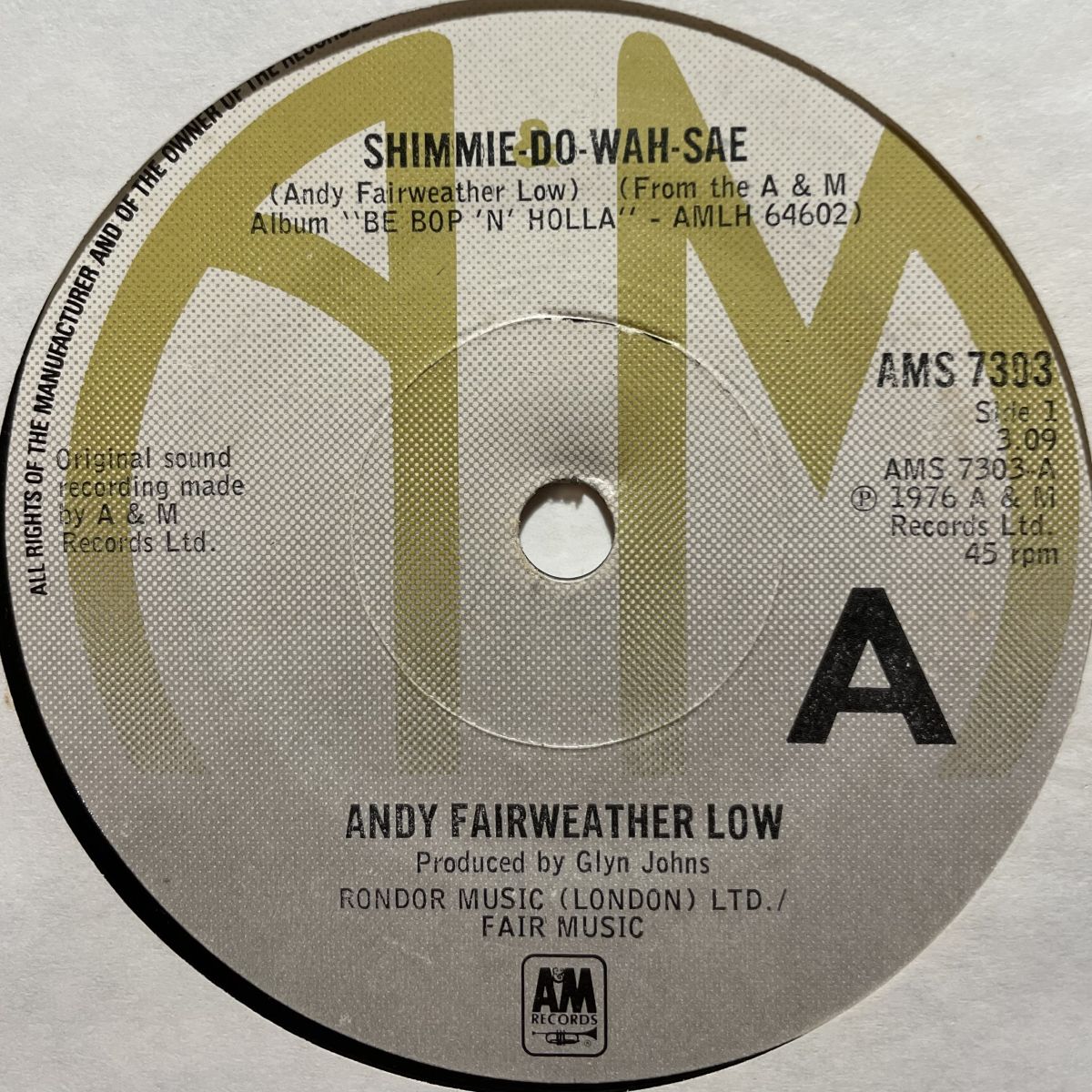 ERIC CLAPTONのバッキングギタリストとしてもおなじみのォAMEN CORNER経由FAIRWEATHERのリードVOCALとしても活躍したUS歌手ANDY FAIRWEATHER LOWの1976年ソロアルバムBE BEP N HOLLAからSHIMMIE DO WAH SAEを抜粋したA&MレーベルリリースSEVEN INCシングル盤。ワクワクする軽快なBEATに心地良いギターリフ、艶やかホーンが彩りを添えたこの爽快さは唯一無二でございましょうッ!!!