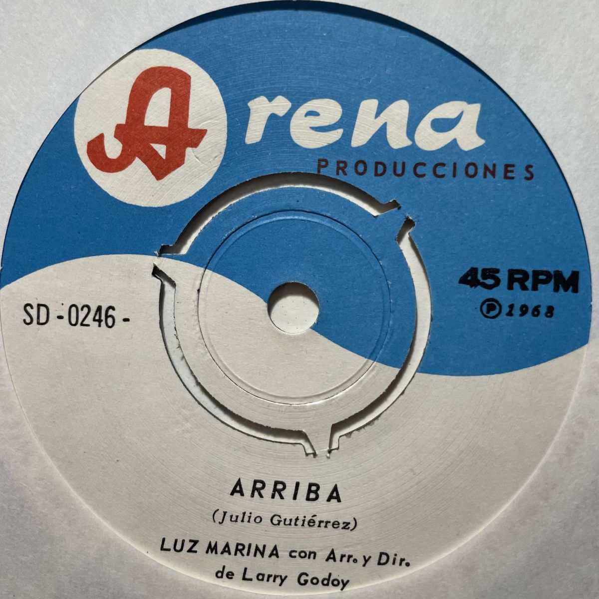 南米チリR&B-POPSシンガーLUZ MARINAの1968年ご当地ローカルARENAレーベルリリースSEVEN INCシングルARRIBA。流石に皆さまごぞんじの名立たる人気レーベル数々も未開拓、当たり前ですがコンピ未収録の音源でございますから知名度はゼロ、ですがJULIO GUTIERREZ作のワイルドエキゾ傑作ARRIBAを熱唱しちゃった肝っ玉ネエさんLUZ MARINAの事を放っては置けないでしょうッ!!!カップリング曲にドッキドキの常夏リゾートロマンスA TU MANERAを収録ってこんな素敵な出会いがまだまだこの地球上に存在するんですね。YESラスイチです!!!
