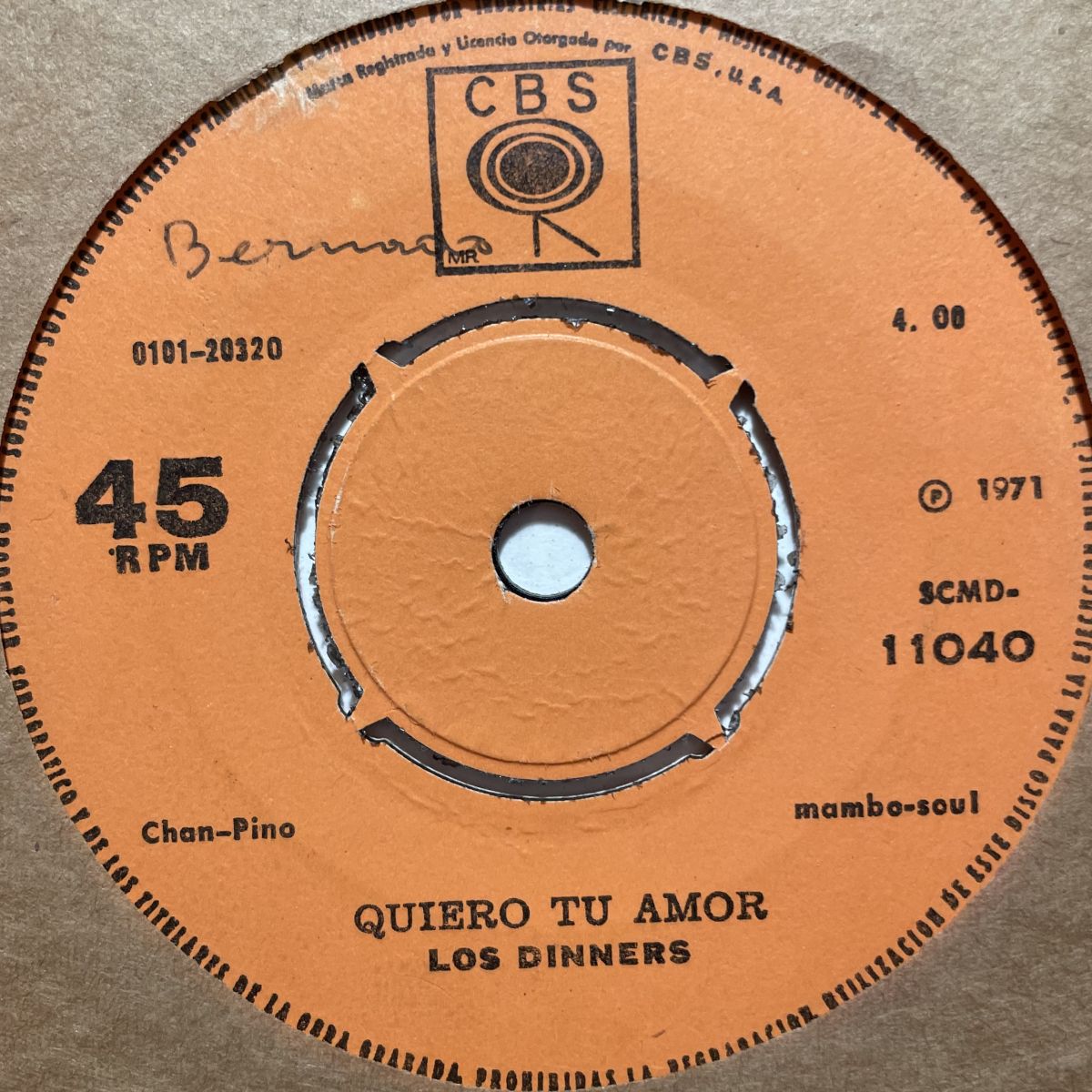 MEXICOランチェラTEX-MEXバンドLOS DINNERSの1971年CBSレーベルリリースSEVEN INCシングルQUIERO TU AMOR。旅先でフラっとひとりで立ち寄った地方の鄙びなスナックで極上のタマに出会ってしまった運命的サイケデリックLATINエキゾBREAKS!!!お客さま、遠路遥々密林の奥深くの最深部迄足をお運び頂き誠にありがとうございます。