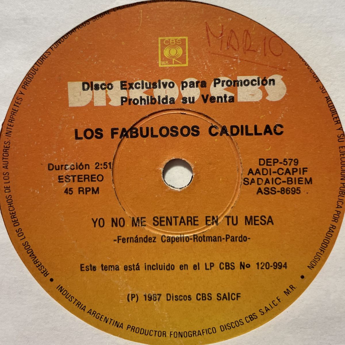 今や世界的人気を誇るアルゼンチンSKAミクスチャバンドLOS FABULOSOS CADILLACSの1987年2NDアルバムYO TE AVISEから収録曲MI NOVIA SE CAYO EN UN POZO CIEGOを抜粋したCBSレーベルリリースSEVEN INCシングル盤。FAB.CADILLACSはオリジナルもカバー曲も大好きな曲盛り沢山ですが、ボクは初期音源中だと先ず外せないのがコチラMI NOVIA SE CAYO EN UN POZO CIEGOだと思います!!!SEVENシングルは南米アルゼンチンONLYリリースなので今はかなりRAREっすよッ
