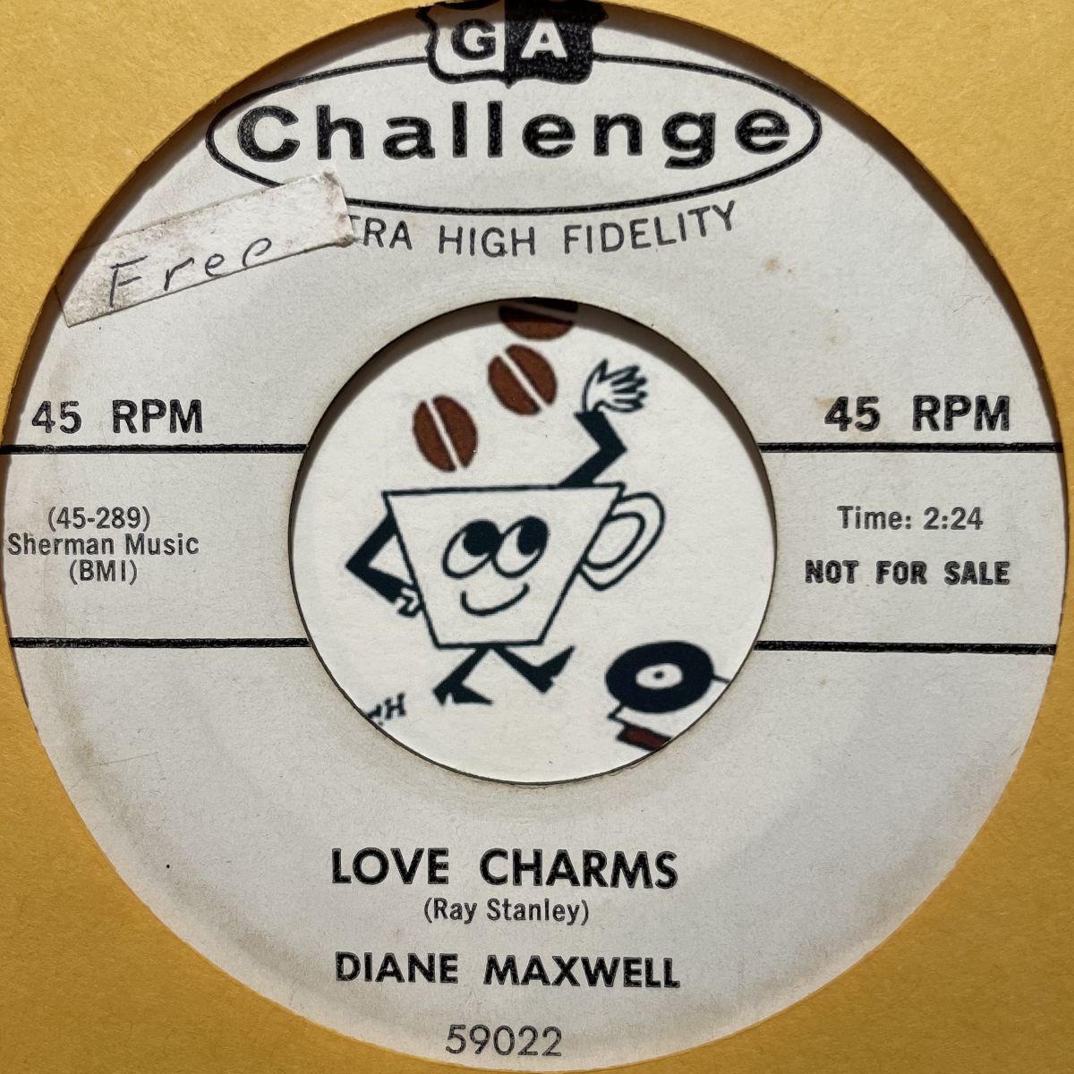 US JAZZシンガーDIANE MAXWELLの1958年CHALLENGEレーベルプロモSEVEN INCシングルLOVE CHARMS。お聴きの通りエロ系のSEXYエキゾJAZZで、その類のガールズPOPCORNではTOPクラスの魅力だと男のオレが断言致しますッ!!!!!多数のコンピ盤にPICK-UPされておりますが、どの作品も選曲監修はマチガイナク愛に飢えた男だろう。キレイな盤と出会うのは運命的、、、一緒ですね何事も!!!