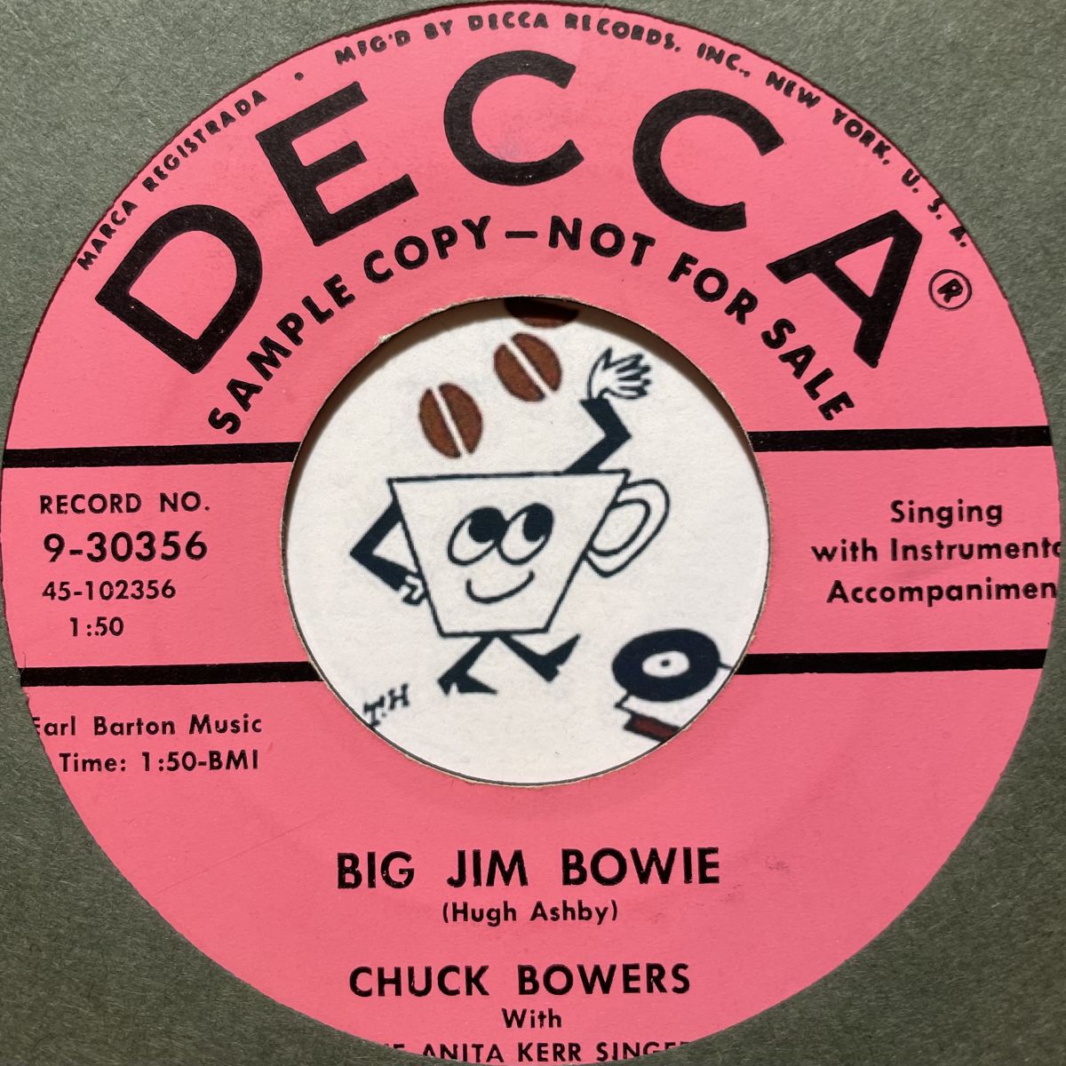 US本場ナッシュビルカントリーBLUESシンガーCHUCK BOWERSの1957年DECCAレーベルリリースSEVEN INCシングルBIG JIM BOWIE。本場コッテコテのカントリーMUSICならば専門店にてお買い求め頂けばヨシなのですが、お聴きの通りコレは別枠、みんな大好きSIXTEEN TONSノリのキメッキメ男気POPCORNでございますからねッ!!!!!