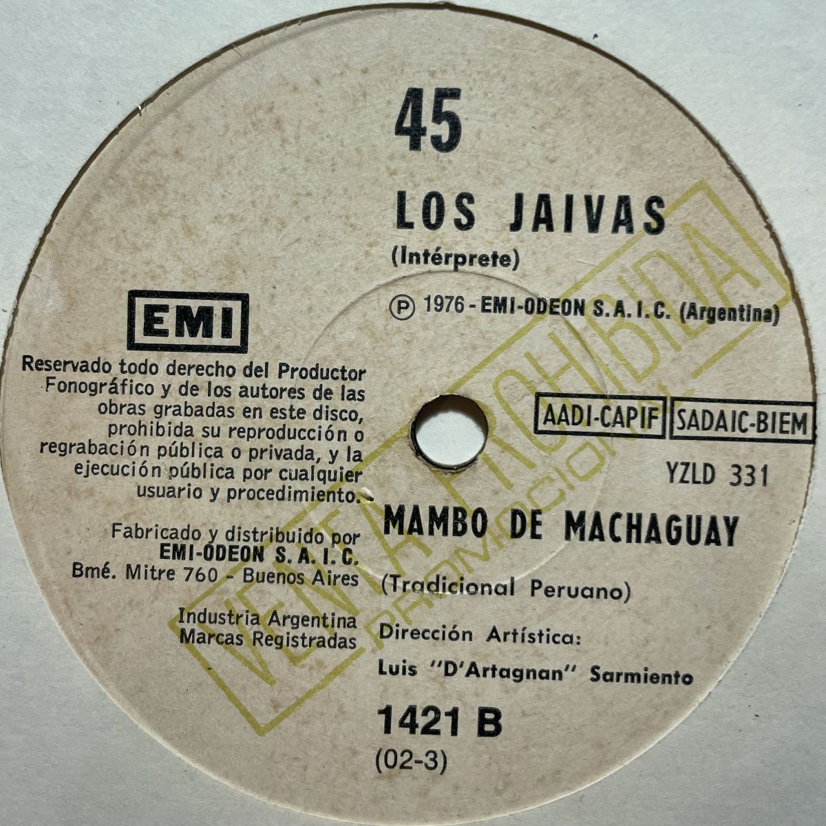 南米チリを代表する大御所プログレROCKバンドLOS JAIVASの1981年傑作アルバム収録曲MAMBO DE MACHAGUAYの76年アルゼンチンEMIレーベルプロモSEVEN INCシングル盤。聴けば世界が納得のアルバム最狂の牧歌サイケBREAKS決定版で、腰から砕けそうなズンドコBEATでフロアを騒がす標高バリ高のアンデス産サイケMAMBO大傑作なのさッ!!!!!迷わず飛び付け迷わず踊れッ
