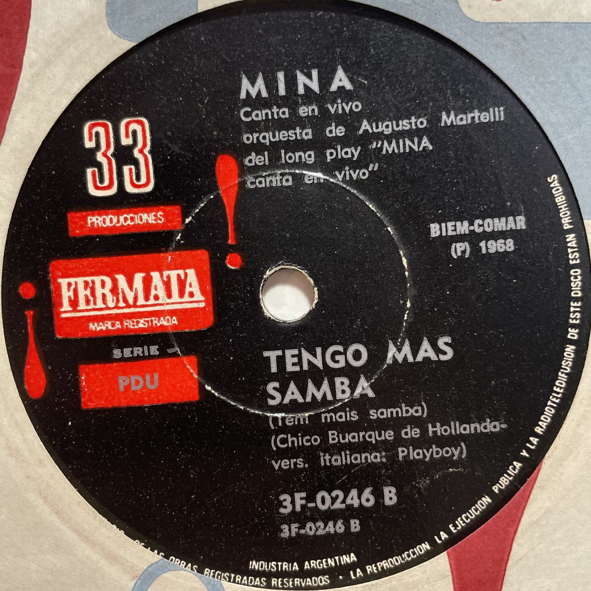 イタリアを代表する大衆POPS歌手女帝MINAの1968年LIVEアルバムMINA ALLA BUSSOLA DAL VIVOから収録曲TENGO MAS SAMBAを抜粋したアルゼンチンFERMATAレーベルリリースSEVEN INCシングル盤。みんな持ってる?みんな知ってるあの豪華LIVEアルバムからのシングルカットで、アルバムCANTA O BRASIL収録テイクのブラジル盤SEVENとはワケが違うのさッ!!!!!おそらくこのテイクのSEVENシングルは地球上でアルゼンチンONLYプレス、自ずとRAREでございます。ELLIAMA PITTMAN、QUARTETO EMCYやCLAUDETTE SOARESも同曲カバーを披露しておりますが、お聴きの通りMINAのこのLIVEテイクがイチバン強烈、圧倒的なインパクトですよねッ!!!