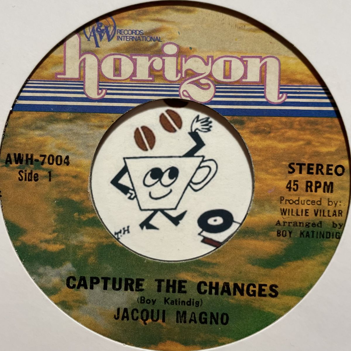 実は我が国ニッポンから世界デビューを果たしたフィリピン出身の出稼ぎJAZZシンガーJACQUI MAGNO(ジャッキーマグノ)の1982年フィリピンご当地ローカルA&W HORIZONレーベルリリースSEVEN INCシングルCAPTURE THE CHANGERS。日本録音世界デビュー1STアルバムと85年フィリピンリリース2NDアルバムTIK TAKの狭間リリースで、しかもシングルONLYリリースでございますから和モノ愛好家も亜モノコレクター、JAZZやSOULファンやベテランDJですら先ずノーマークの知られざる逸品であり極RAREアイテムでございます!!!彼女の作品は再発された1STアルバム、CITY-POPでナウな2NDアルバム、フィリピンで所属したFUNKバンドCIRCUS BANDの作品、どれもが全て高額RAREなワケですが、何より先ずお目に掛れませんからね!!!!!現地へ行こうが何年待とうが無理なモノは無理です、3代続く家宝クラスの逸品です。