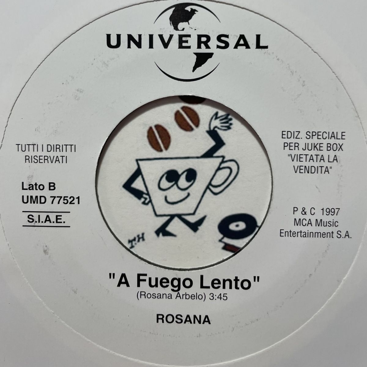 SPAINフラメンコPOPS歌手ROSANAの1997年UNIVERSALレーベルプロモSEVEN INCシングルA FUEGO LENTO。とにかく高い空が似合う哀愁纏った情熱的VOCALが実に魅力的で、何処までも登り詰める高揚感もこれからの季節にピッタリ、フロアの爆音で陶酔したい至福のオリジナルVERSIONでございます。ダメREMIX収録のチープ12INCは最寄りの量販店でお買い求め下さい。