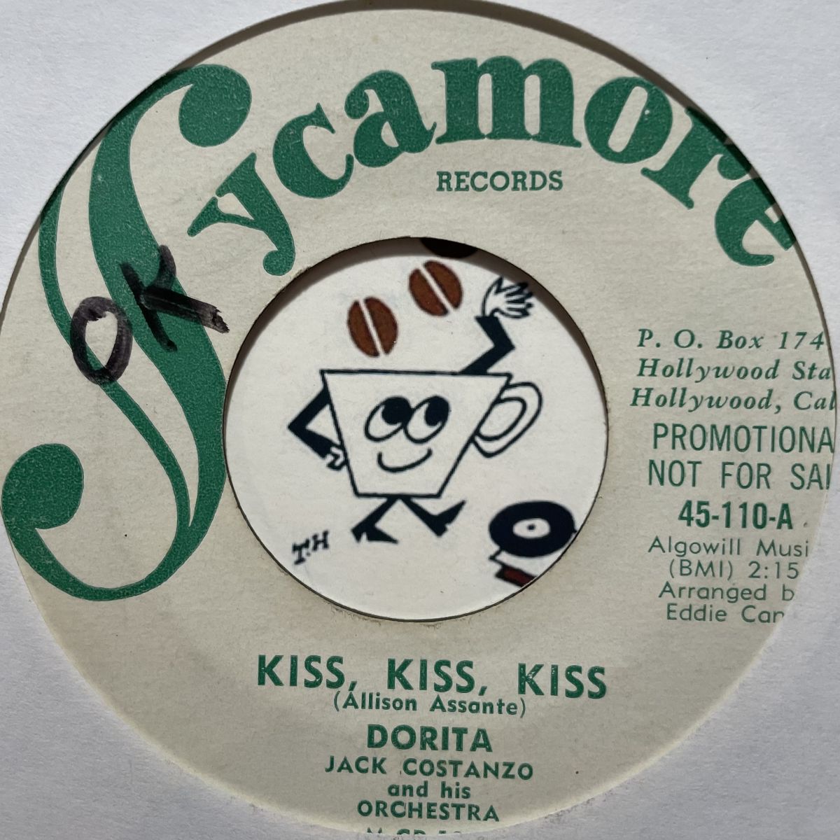 詳細は不明ですがJACK COSTANZO楽団演奏、アレンジをEDDIE CANOが手掛けちゃった無名のUSローカルシンガーDORITAの1959年SYCAMOREレーベルプロモSEVEN INCシングルKISS KISS KISS。ハリウッドに短命で存在したSYCAMOREレーベルの存知ないシンガーの単発シングル、素人さんが探して辿り着ける代物じゃァございませんね!!!この道22年目のオーパス店主が偶然出会ったお宝盤、運も実力も関係ないって事になる。たまたまっすタマタマ。まァしかし宝くじってさ、買わなきゃ当たらないワケですならね。ラッキーです!!!