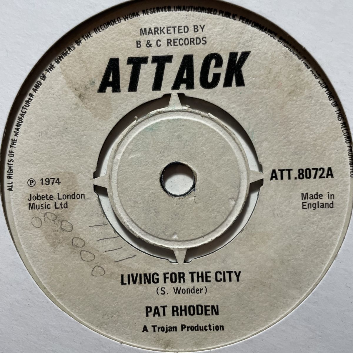 UK REGGAEシンガーPAT RHODENの1974年ATTACKレーベルリリースSEVEN INCシングルLIVING FOR THE CITY。タイトル通り&試聴通りのS.WONDER名曲LIVING FOR THE CITYカバーでございますから既にボクのコメントなど必要ナシでございますよねッ!!!!!イエス大好物です。