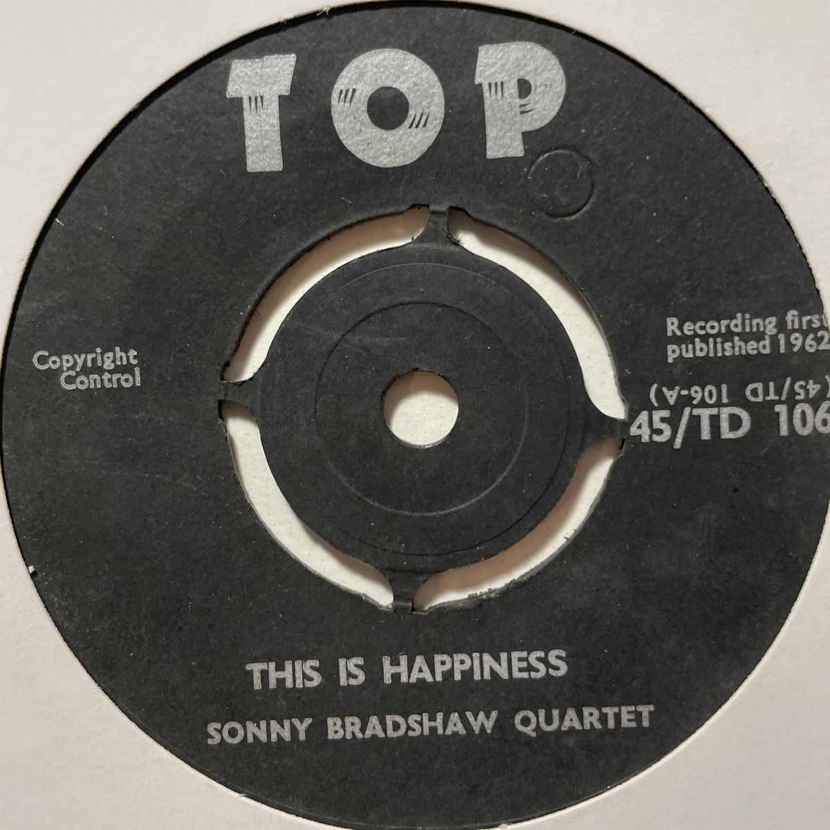 JAMAICA出身のJAZZトランペット奏者SONNY BRADSHAWことCECIL CALENTINE BRADSHAWのカルテット演奏1962年UK TOPレーベルリリースSEVEN INCシングルTHIS IS HAPPINESS。メキシコのLATIN鍵盤奏者ALFREDO MENDEZ、プエルトリコLATINマスターTITO RODRIGUEZの名演をでおなじみのタイトルESTO ES FELICIDADことTHIS IS HAPPINESSカバーで、ワタクシの大好物タイトルのヒトツでございます。当たり前ですが自画自賛!!!!!誰にもご迷惑はお掛け致しません、個人的な趣味のTOP-WANT盤でございますよ。