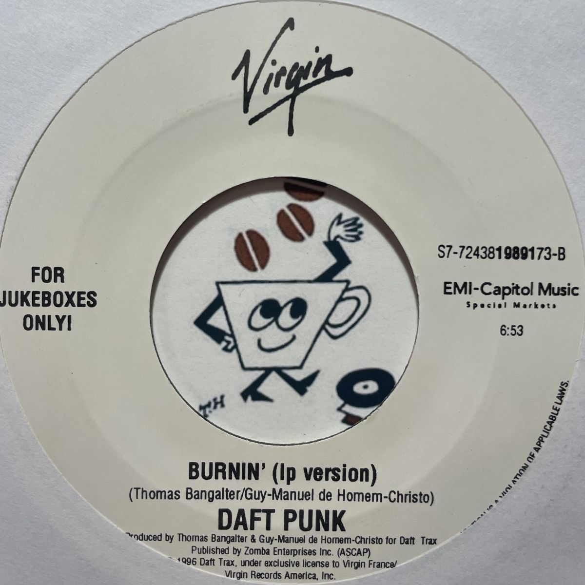 フランスのエレクトロHOUSEデュオDAFT PUNKの1996年衝撃デビューアルバムHOMEWORK収録曲BURNINのVIRGINレーベルJUKE-BOXプロモSEVEN INCシングル盤。AROUND THE WORLD、DEGITAL LOVEを既にGET済みの皆さまはコチラBURNINのプロモSEVENもそろそろねッ!!!欲しくなる頃でしょう。
