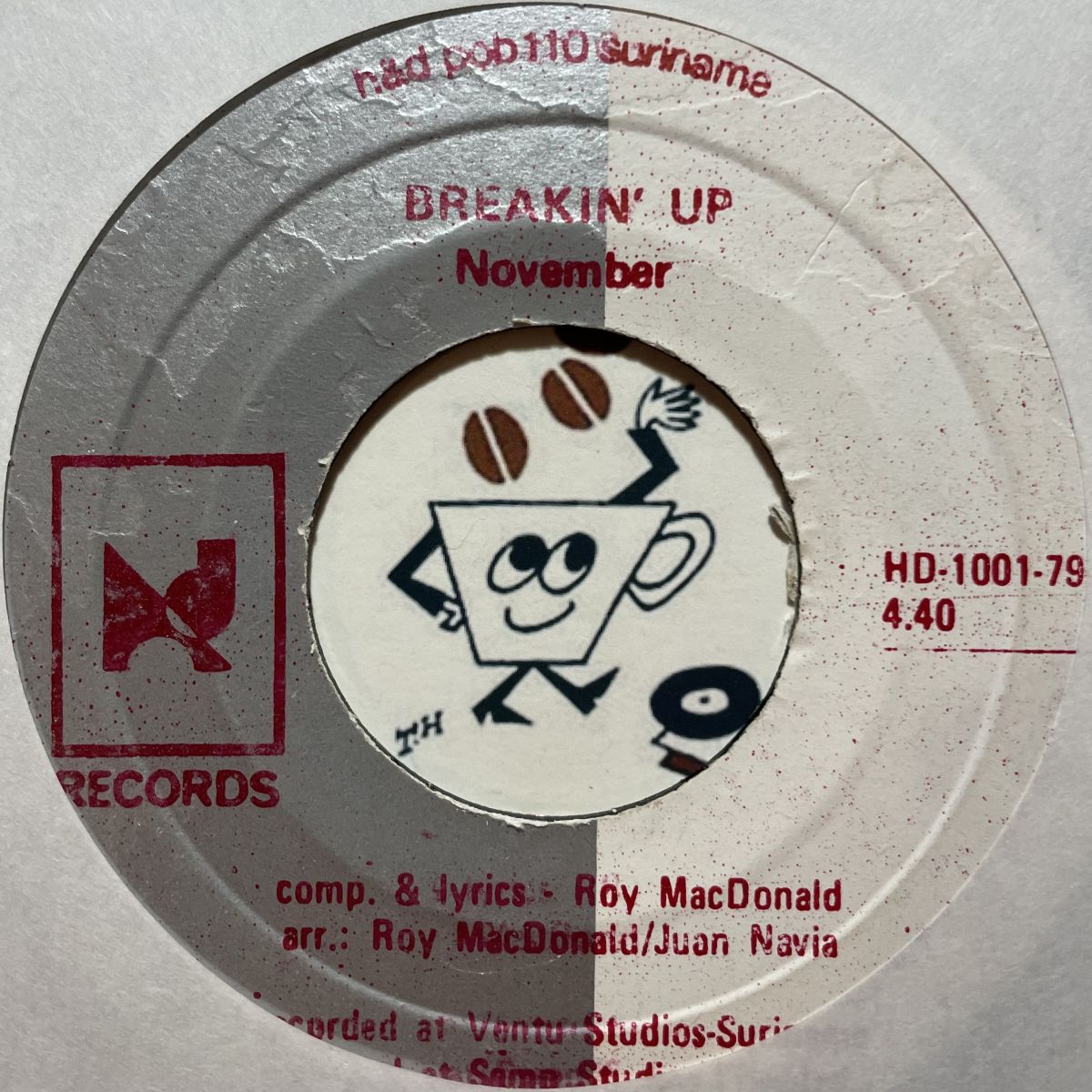 スリナム共和国のDISCOソウルバンドNOVEMBERの70S HD RECORDSレーベルリリースSEVEN INCシングルBREAKIN UP。いつもの事、詳細は不明ではございますが殿方ズキュン系の乙女モダン傑作BREAKIN UP、POPでキャッチーな耳触りがフロア浸透力抜群のDAY BY DAY共に聴かなきゃソンソン!!!!買わなくてもこれからの人生には全く支障なしですが、出会いはプライスレスですよ。