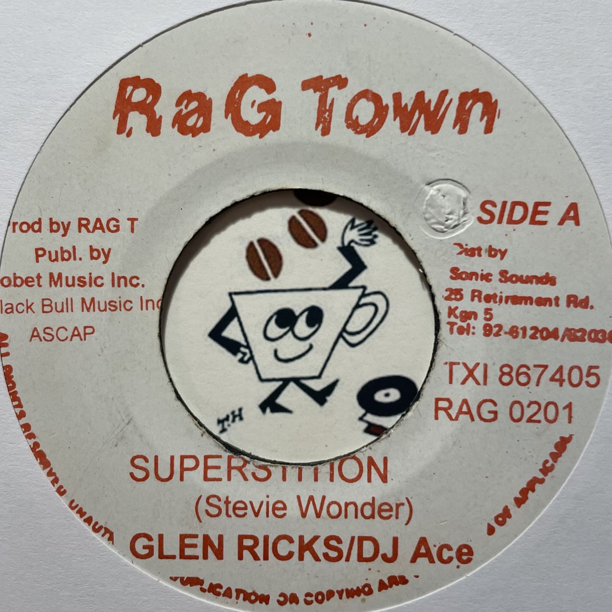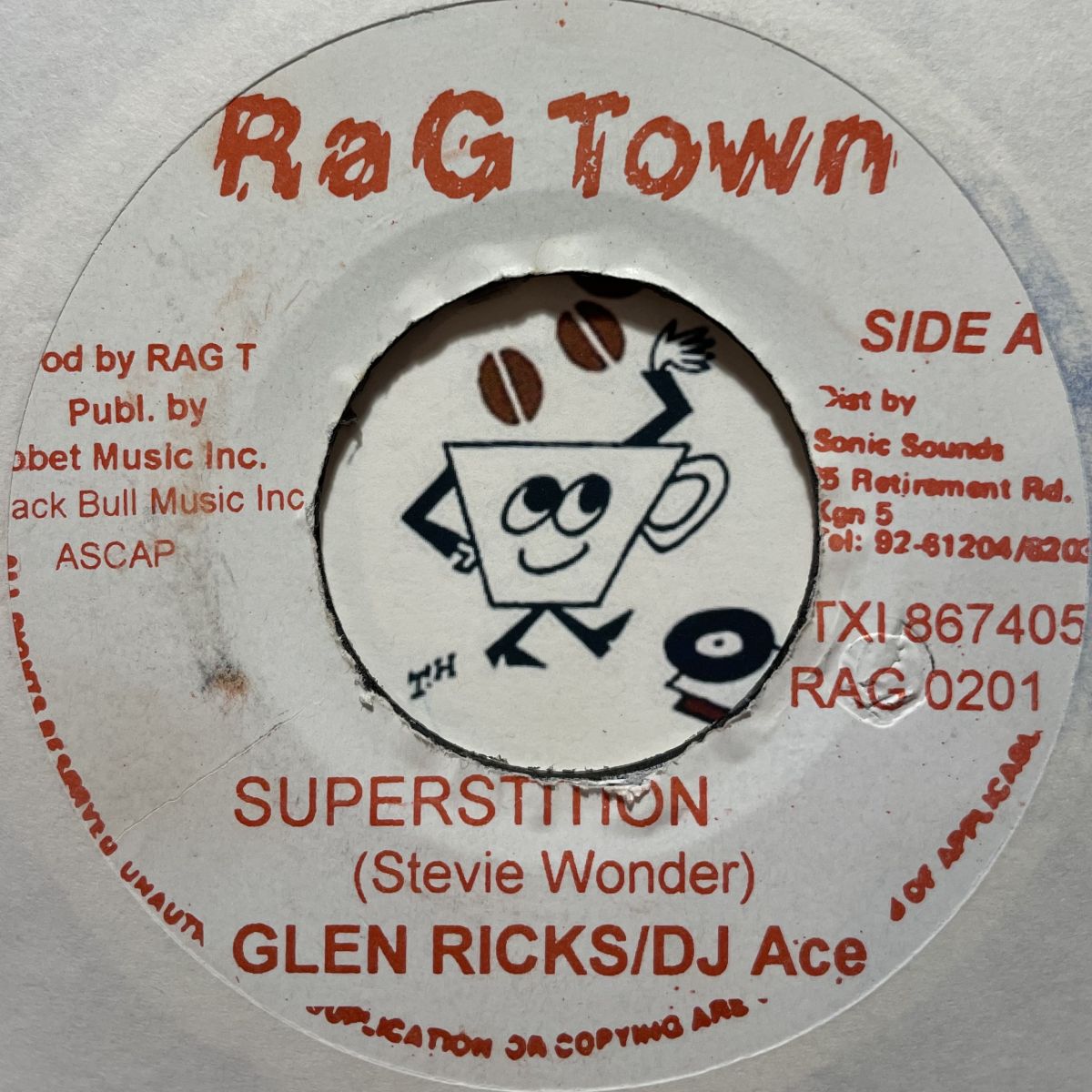 THE FABULOUS FLAMESメンバーGLEN RICKSのおそらく80SリリースRAGTOWNレーベルSEVEN INCシングルSUPERSTITION。タイトル通りS.WONDER大名曲SUPERSTITIONをRAGGAEアレンジでカバーした血統書付きのフロア仕様ッ!!!コレはねェとにかくまともなプレスの盤がなかなか出回らないってヤツのまさに代表格でございます、、、若かりし日の合コン並みにとにかく出会う度におブスばかりなのですが、安心して下さい試聴の通りのベッピンさんが到着致しましたよッ!!!