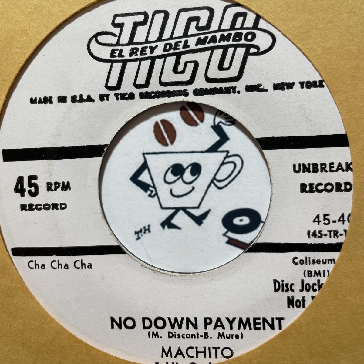 プエルトリコ出身LATINマエストロFRANK MACHITO GRILLO率いるMACHITO AND HIS ORCHESTRAの1958年傑作アルバムMI AMIGO MACHITOから収録曲NO DOWN PAYMENTを抜粋したTICOレーベルプロモSEVEN INCシングル盤。全国最寄りの量販店で買えるアルバム収録曲だからってナメたらアカンっすよ。とっても上質、お値段以上に満足出来るLPですから、未所持の方は先ずアルバムMI AMIGO MACHITOを買って聴いて下さい。間違いなくその後直ぐにコチラのRAREシングルが欲しくなります、ボクみたいにね。
