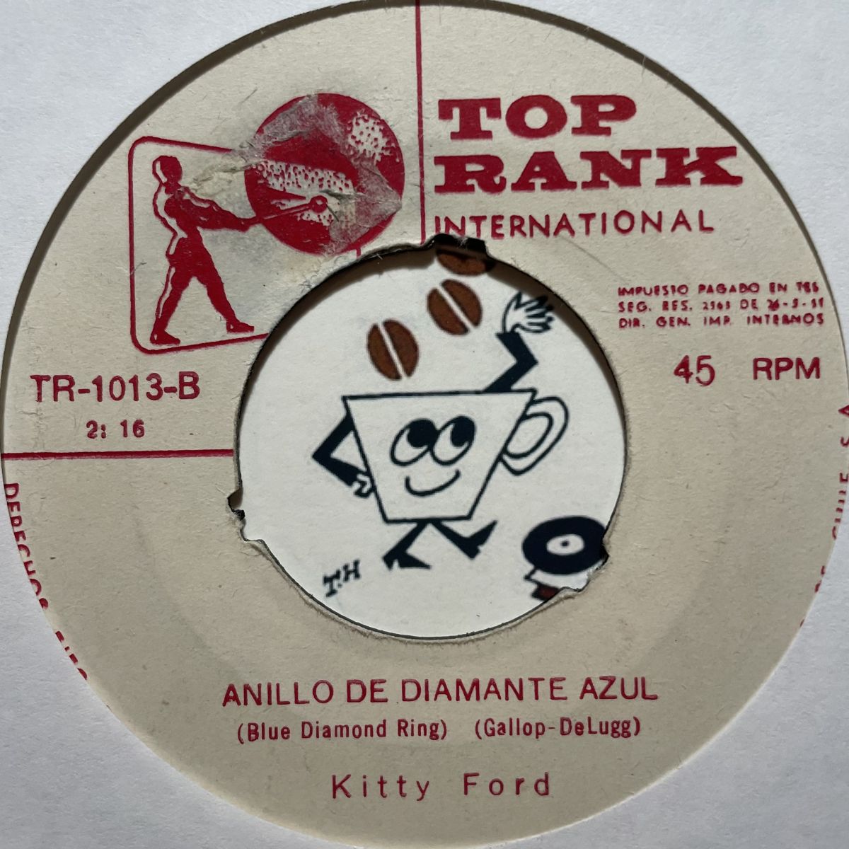 US R&BシンガーKITTY FORDの60S TOP RANKレーベルリリースSEVEN INCシングルBLUE DIAMOND RING。試聴の通りRARE POPCORN最高峰BETTY OBRIENのSHELL BE GONEにソックリでしょッ!!!みんな大好きJAZZMAN傘下POPCORNレーベルからコチラのBLUE DIAMOND RINGにそのSHELL BE GONEカップリングで再発されておりますが実に好い仕事でございますねッ!!!男ならば共にオリジナルでGETって事で先ずはコチラをどうぞお納めくださいッ!!!1番ってTシャツ着てる感じ?決して恥かしいってワケじゃないけれどラベルに思いっ切りPOPCORNって印刷されてるの好きじゃァないです。