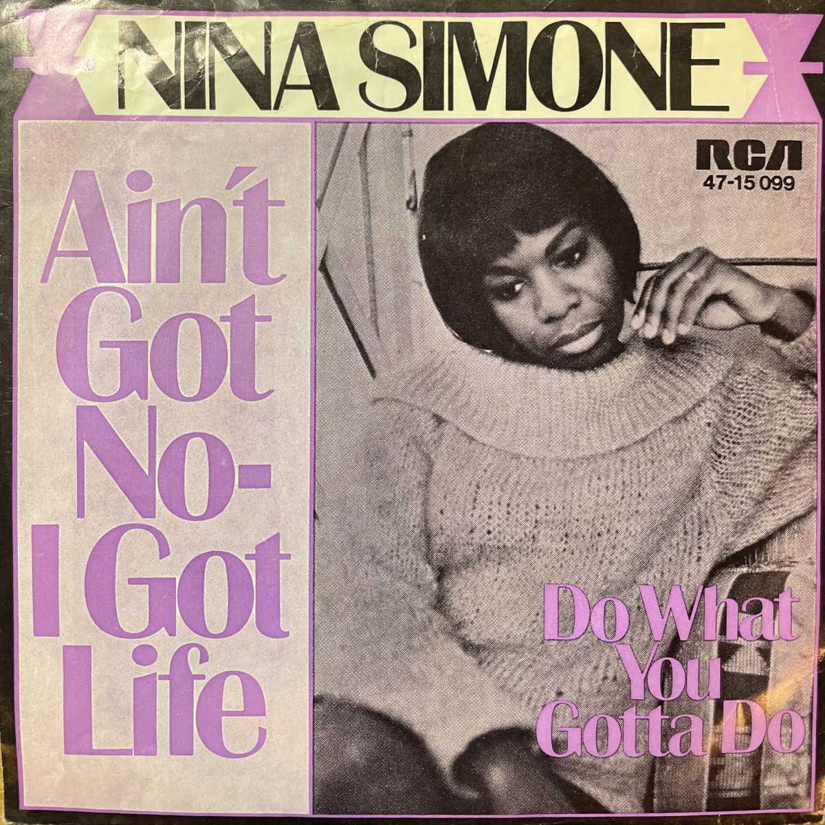 USノースカロライナ出身の黒人女性シンガー兼ピアニストNINA SIMONEの1968年アルバムIN CONCERTからAINT GOT NO I GOT LIFEを抜粋したRCAレーベルリリースSEVEN INCシングル盤。お聴きの通りアルバムとは別テイク、ガキ達大合唱の激アツVERSIONで、しかもSEVEN INC音圧◎ですから伝わるテンションも2割り増しなのさッ!!!ジャケ付きだし3割りかもね。