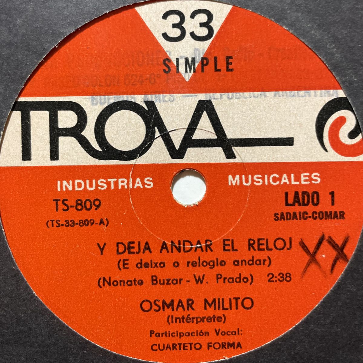 QUARTETO FORMAメンバー、ブラジル屈指のPOPSソフロ職人であり天才ピアニスト作曲家OSMAR MILITOのコーラスQUARTETO FORMA、レコーディングにMARCOS VALLEが携わりLUIZ ECAがアレンジを手掛けた1971年黄金体験1STアルバムからタイトル曲E DEIXA O RELOGIO ANDARとQUE BANDEIRAを抜粋したアルゼンチンTROVAレーベルONLYリリースSEVEN INCシングル盤。先ずは1STアルバム冒頭を飾ったNONATO BUZAR作HAPPYソフロSAMBA別天地、コレが本当の夢の国E DEIXA O RELOGIO ANDAR、QUARTETO FORMAのコーラスが乱舞大回転するM.VALLEカバーQUE BANDEIRAを抜粋しちゃったTROVAレーベル恐るべしッ!!!!!このシングルの存在には長年時間とお金と愛情を惜しげもなく継ぎ込んできた筋金入りの本気ブラジル盤コレクターの皆さまが最も驚いているのではないでしょうか?最もRAREかつ入手困難だと言われるMARACATU ATOMICOシングルをも凌駕する存在でございましょうッ!!!オークションにしたい逸品です。