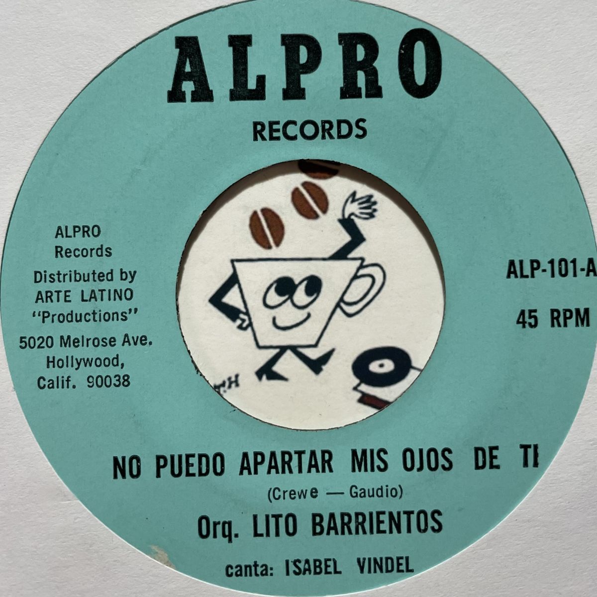 CUMBIA EN DO MENORの衝撃で全世界のフロアにその名を知らしめた南米コロンビアの誇る最強敏腕バンマスLITO BARRIENTOSのUS進出作品MOSAICOS DE LITOからNO PUEDO APARTAR MIS OJOS DE TIを抜粋した1970年ALPROレーベルリリースSEVEN INCシングル盤。CUMBIAってキーワードが聴かず食わず嫌いの皆さまもCANT TAKE MY EYES OF YOUカバーって事ならばそや話は別でございましょうッ!!!!!勿論ワタクシは共に大大大好物です。