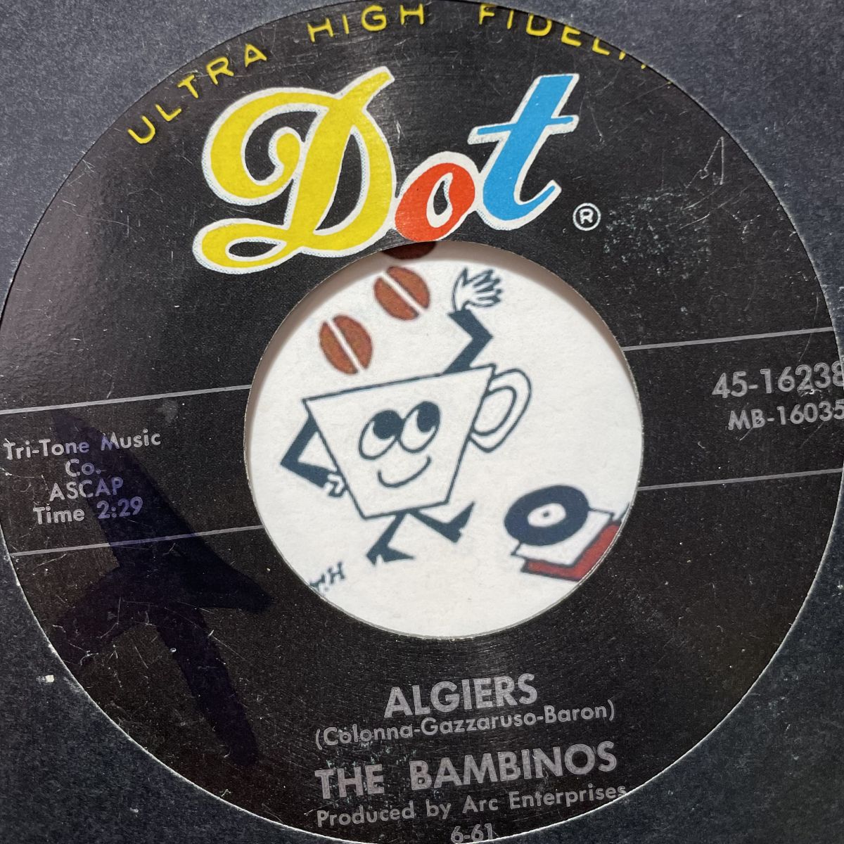 ベンチャーズギタリストGERRY MCGEEが在籍したUSガレージR&RグループTHE BAMBINOSの1961年DOTレーベルリリースSEVEN INCシングルALGIERS。メンバーにはコレまたベンチャーズドラマーMEL TAYLORの実弟LARRYやモンキーズ面々も絡んおり、決してアリガチな只のテケテケSURFエレキインストでは済まないヨダレ滴るエキゾTITTY-SHAKERチューンに仕上がっておりますよッ!!!!実にアジエンス。