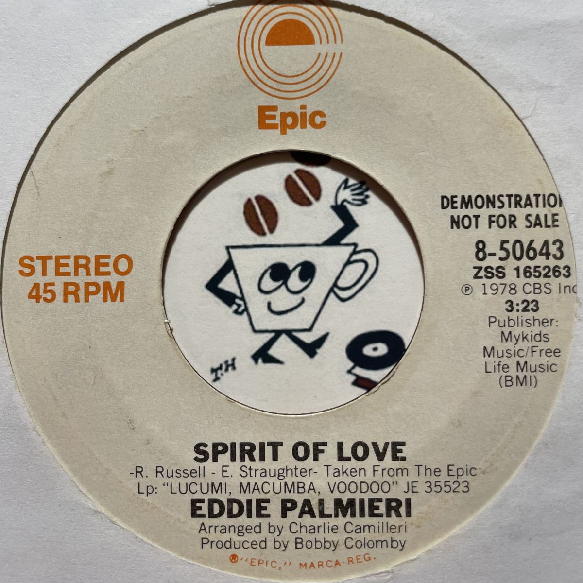 NYサルサ巨匠ピアニストEDDIE PALMIERIの1978年アルバムLUCUMI MACUMBAから屈指のハイライトSPIRIT OF LOVEを抜粋したEPICレーベルプロモSEVEN INCシングル盤。ROOTSOULカバーやキングSUPER SAMBA BREAKSでおなじみの逸曲がSEVEN INCでご無沙汰の再登場!!!!!野太いイントロは聴いての通りCUMBIAやLATIN-FUNKと併せても相思相愛、相性抜群なのさッ