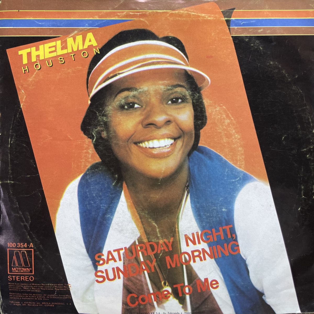 USソウルシンガーTHELMA HOUSTONの1979年アルバムRIDE TO THE RAINBOWから屈指のハイライト曲でありフロア定番SATURDAY NIGHT SUNDAY MORNINGを抜粋したスペインジャケ付きSEVEN INCシングル盤。携帯に便利なSEVEN INCシングルでコレも即一軍復帰でございましょうッ!!!!!過ぎた若き日のフロア思い出にしてしまうには実に惜しいってば。