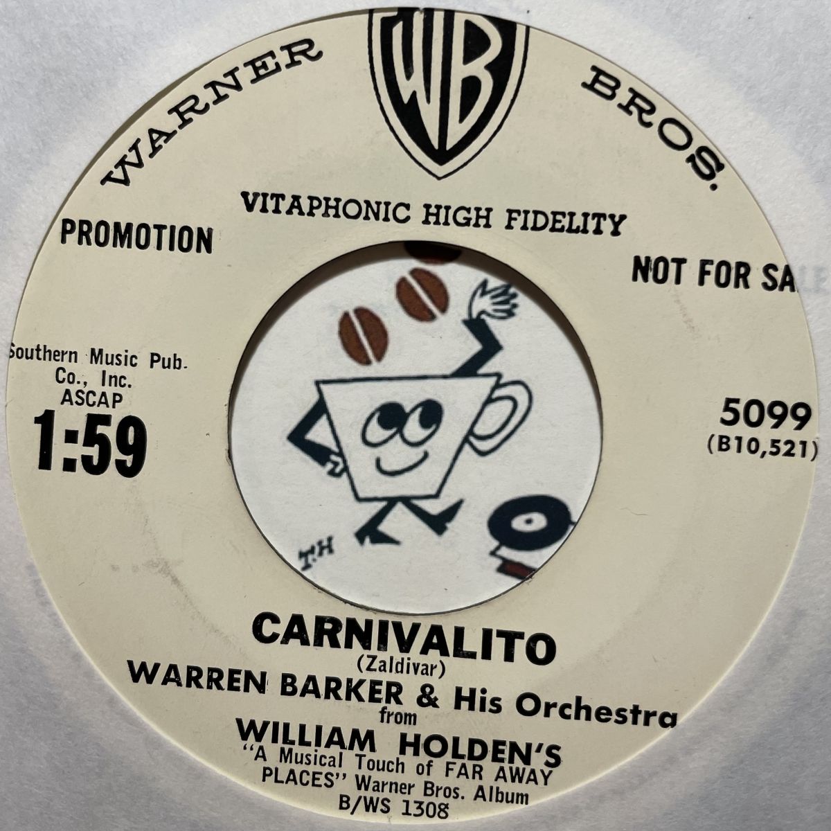 USコンポーサーWARREN BARKER率いるオーケストラWARREN BARKER AND HIS ORCHESTRAの1959年WBレーベルプロモSEVEN INCシングルCARNIVALITO。コチラCARNIVALITOはMONDO-LATIN愛好家の皆さまダケのモノにしておくには少々勿体ない気がする小洒落た映画音楽ソフロテイストでございす!!!きっと素敵な一夜を演出してくれるハズです。