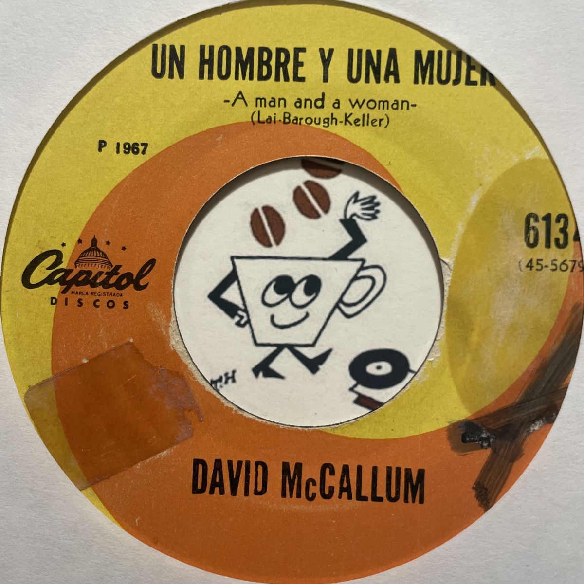 TVシリーズ007のロシア諜報部員ILLYA KURYAKIN、THE MAN FROM UNCLEの検死官DR MALLARD役でおなじみスコットランド出身の俳優歌手DAVID McCALLUMの1967年アルバムMUSIC-ITS HAPPENING NOWから収録曲A MAN AND A WOMAN男と女カバーを抜粋したCAPITOLレーベルメキシコリリースSEVEN INCシングルUN HONMRE Y UNA MUJER。量販店で頻繁にお目に掛るあのアルバムからの抜粋ですが、だからってとっても希少なSEVENシングルをスルーする事は不可能でございましょうッ!!!!!ボーナス抱えて抱きついちゃって下さい。