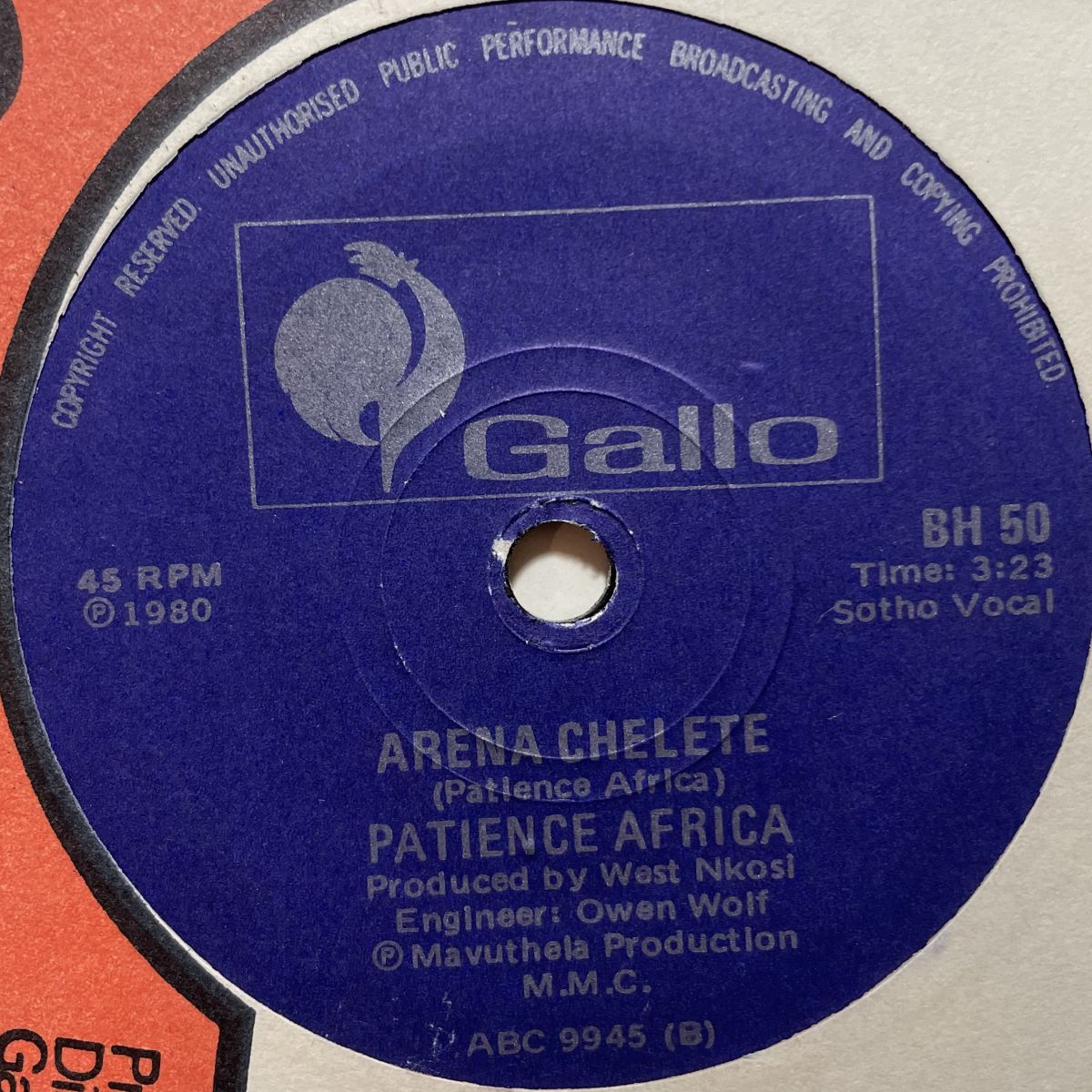 南アフリカ共和国の銀幕女優シンガーソングライターPATIENCE AFRICAの1980年究極RAREアルバムLETS GROOVE TONIGHTから収録曲ARENA CHELETEを抜粋したご当地ローカルGALLOレーベルリリースSEVEN INCシングル盤。南ア産象徴的かつ相応しく吹き抜けるシンセ&野太いベース音、リズミカルかつ呪術的なループで誘うBEATとGUITARが彼女の歌声と交わり完成した唯一無二の異空間ッ!!!LP収録曲中ISILINGO SENDODA、LETS GROOVE TONIGHT、DIVORCEに次ぐ要チェック曲だとボクは思います。ちなみにISILINGO SENDODAとLETS GROOVE TONIGHTは12INCで再発済みですよッ