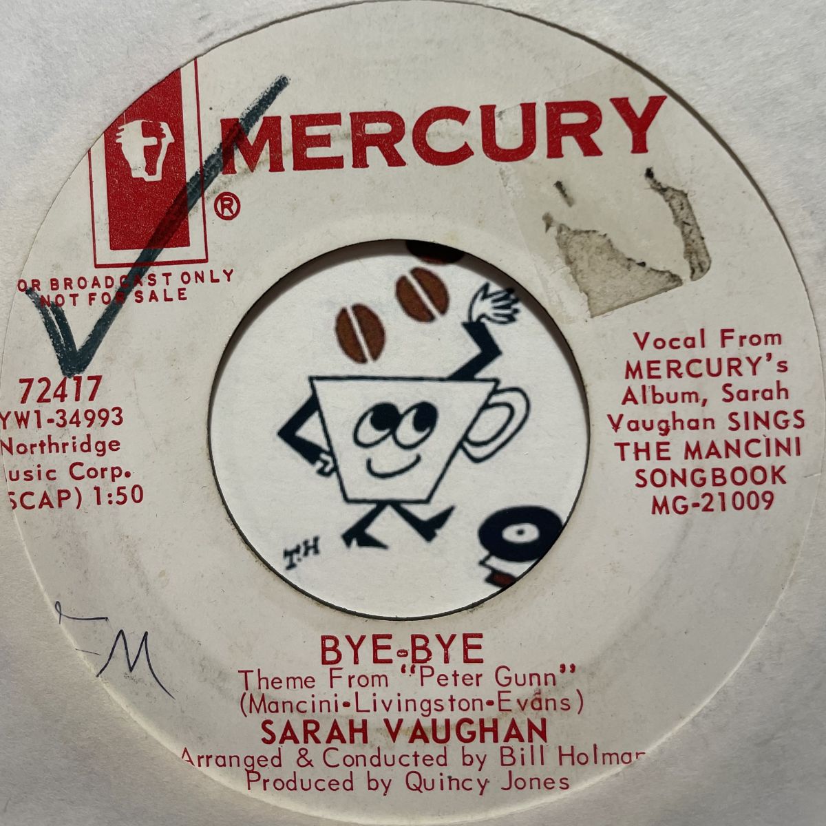 US JAZZシンガーSARAH VAUGHANの1965年MERCURYレーベルプロモSEVEN INCシングルBYE-BYE。お聴きの通りUS探偵ドラマPETER GUNNテーマ曲VOCALカバーで勿論QUINCY JONESプロデュース、アレンジはBILL HOLMANが手掛けておりますね。この風合いはエキゾJAZZ、ヴィンテージR&B POPCOR愛好家の皆さまも要チェックでございましょうッ!!!!!カップリング曲THE PAWNBROKERもボクは大好きです。