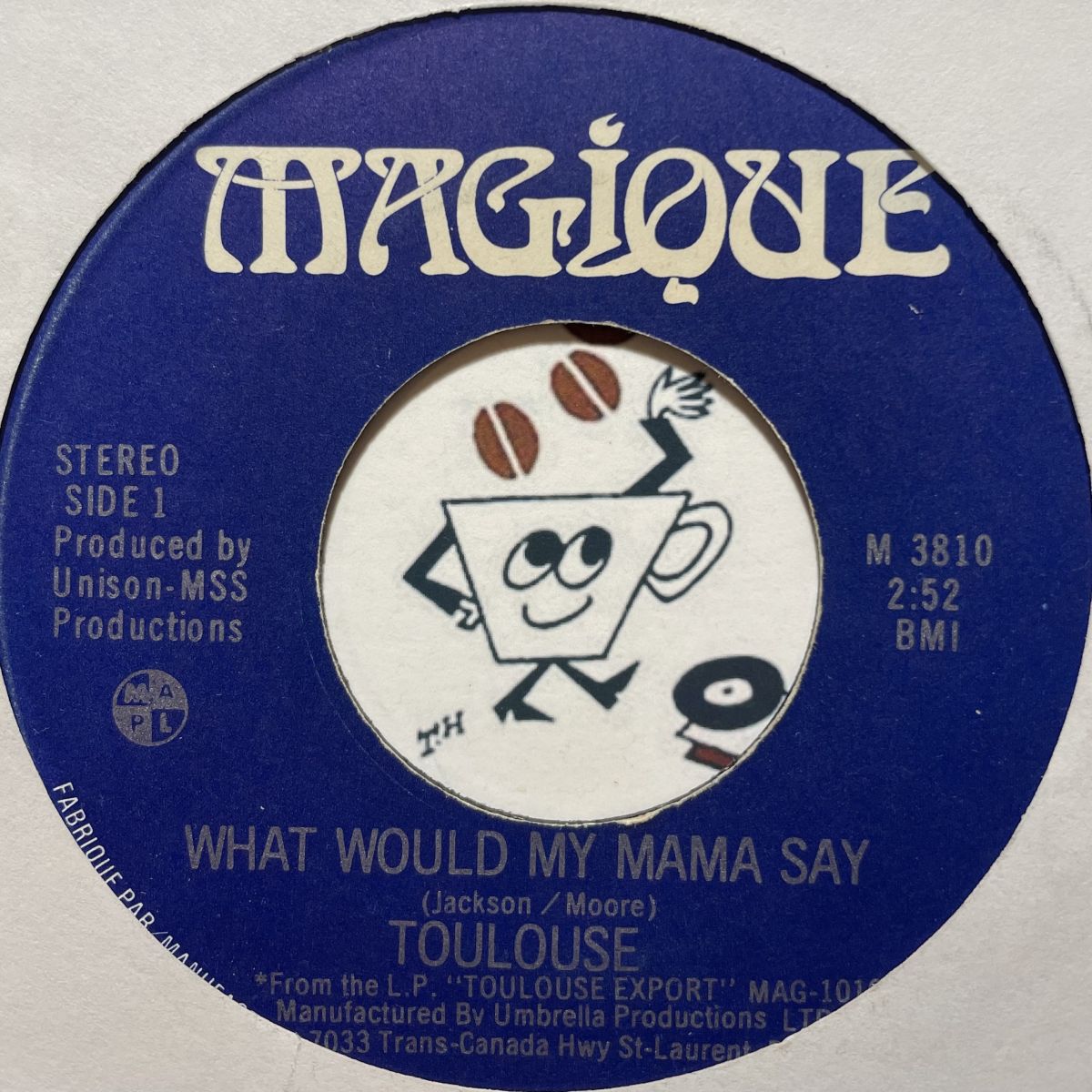 CANADAのFEMソウルグループTOULOUSEの1977年USデビューアルバムからWHAT WOULD MY MAMA SAYを抜粋したご当地ローカルMAGIOUEレーベルリリースSEVEN INCシングル盤。KING御用達のメロウソウルCLASSIC傑作でございますねッ!!!SEVEN INCはなかなか滅多に出会えませんよッ