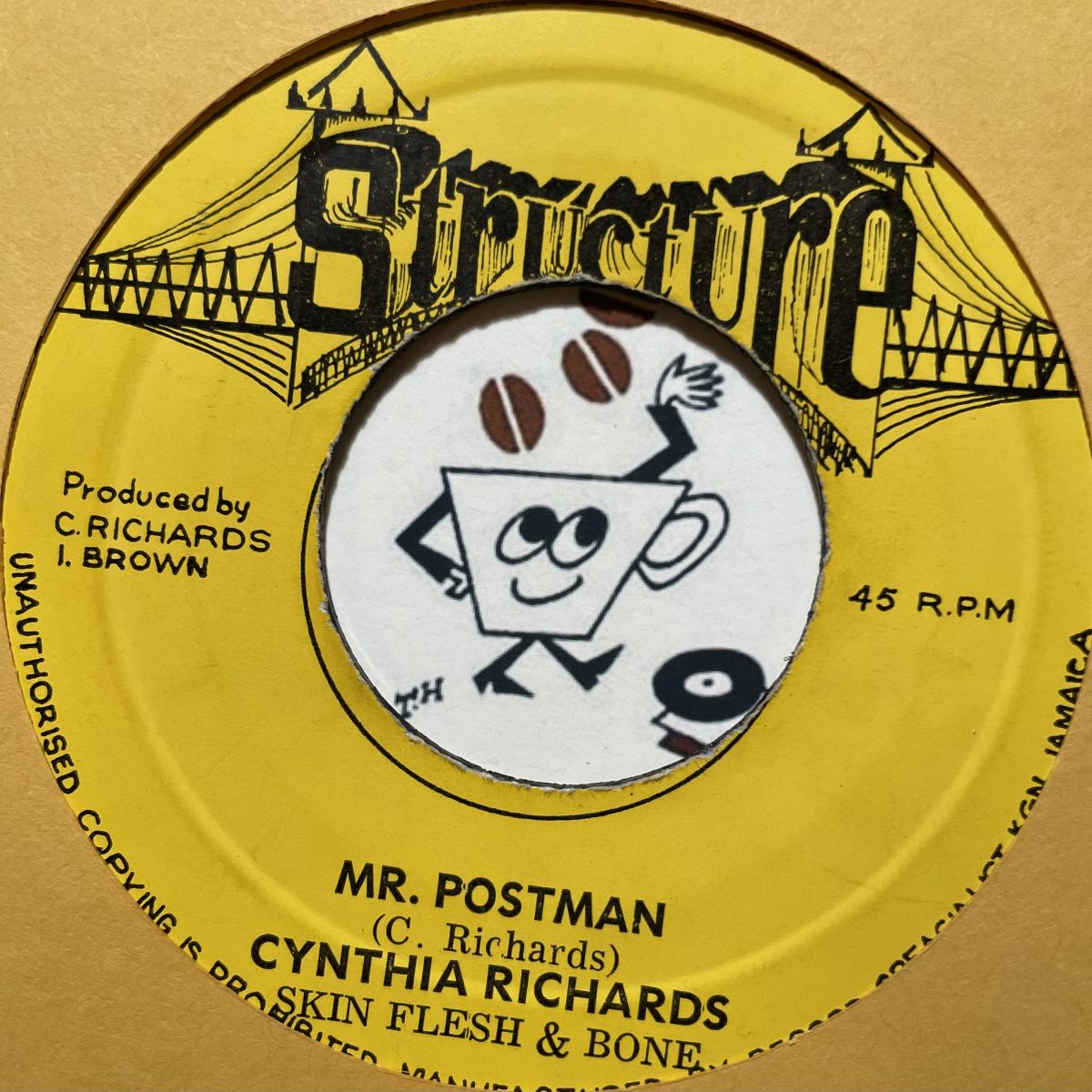 ジャマイカREGGAEシンガーCYNTHIA RICHARDSの1972年ジャマイカSTRUSTUREレーベルリリースSEVEN INCシングルMR. POSTMAN。別シングルではFOR YOUR LOVEやCLEAN UP WOMAN、FOOLISH FOOL等々ソウル名曲をカバーしてますがコチラMR. POSTMANは彼女のオリジナルで、カップリングにはインストVERSIONを収録ございます。カラダの芯まで暖まって下さい!!!