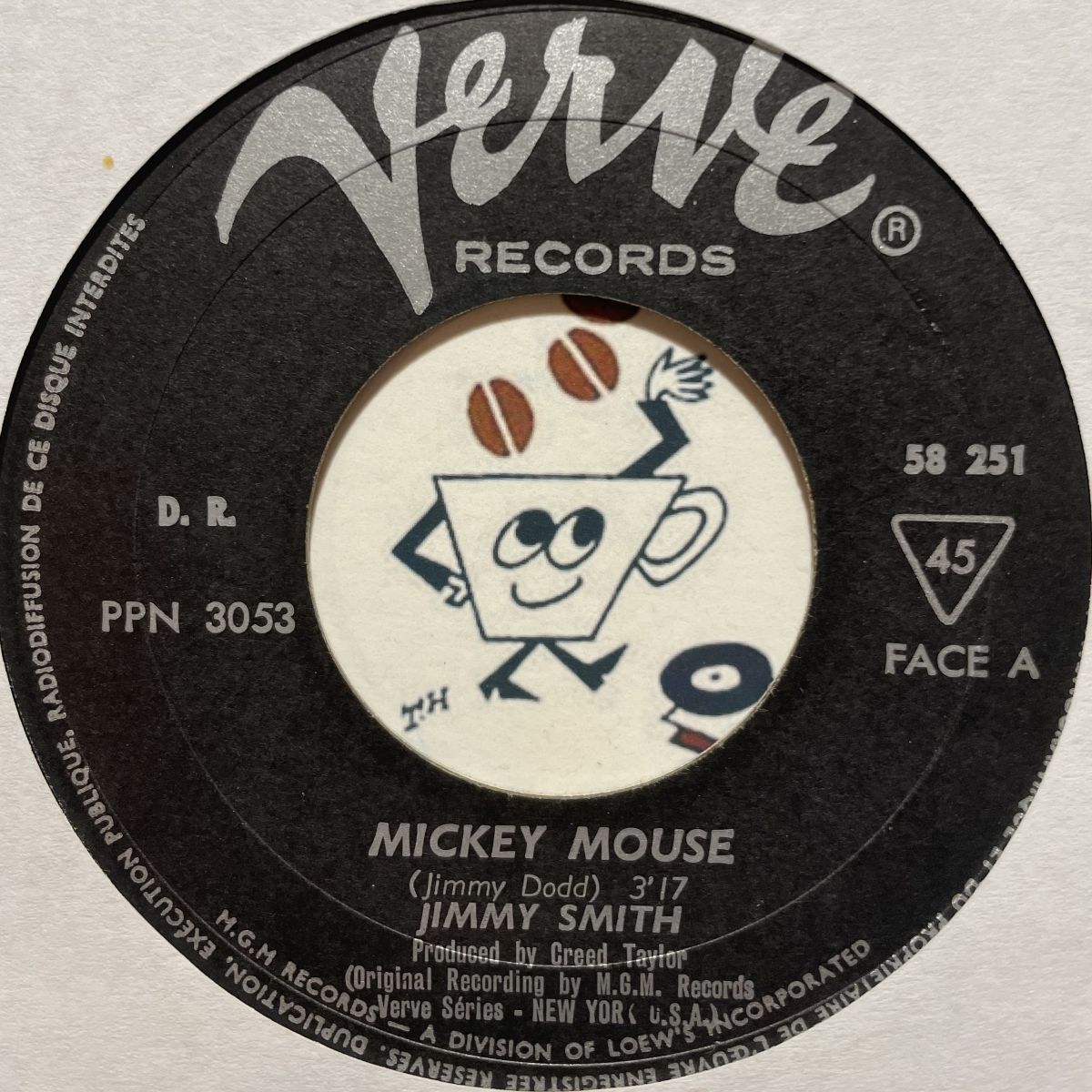 JAZZ-FUNKオルガン帝王に君臨するJIMMY SMITHの1967年VERVEレーベルリリースSEVEN INCシングルMICKEY MOUSE。世代いャいャジャンルの枠を越えて人気のSEVENオンリー曲でございますねッ!!!!!技アリです。
