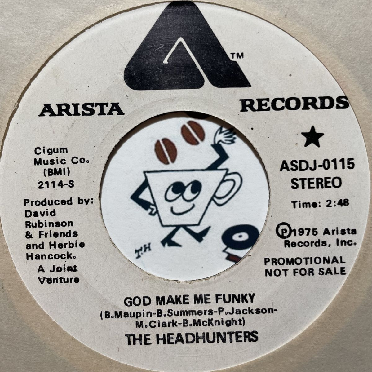 御大HERBIE HANCOCKが在席したUS JAZZフュージョンバンド雄THE HEADHUNTERSの1975年アルバムSURVIVAL OF THE FITTEST収録曲GOD MAKE ME FUNKYのARISTAレーベルMONO/STEREOプロモSEVEN INCシングル盤。BIZ MARKIE他多数のネタネタネタでおなじみのFUNK大名曲でございますねッ!!!!!RAREなヴァイナル盤なのでいつもの約倍値ですが何卒ご了承下さい。星は右上、黒インクのコチラがヴァイナル盤のラベルっす。