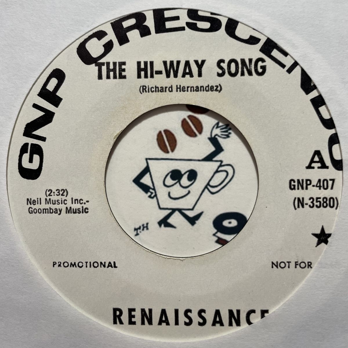 USガレージROCKバンドRENAISSANCEの1968年GNP CRESCONDOレーベルプロモSEVEN INCシングルTHE HI-WAY SONG。若さ弾けたR&RサーフTHE HI-WAY SONGもまぁねェ嫌いじゃ無いのですがカップリング曲GOOMBAYが店主好み過ぎて割愛ッ!!!ジャンルの枠で分ける事が不得手な店主好みな様々な音の粒が見事に濃縮されたスタイリッシュかつエキゾチックなJAZZY-LATINミクスチャ決定版なのさッ!!!!!