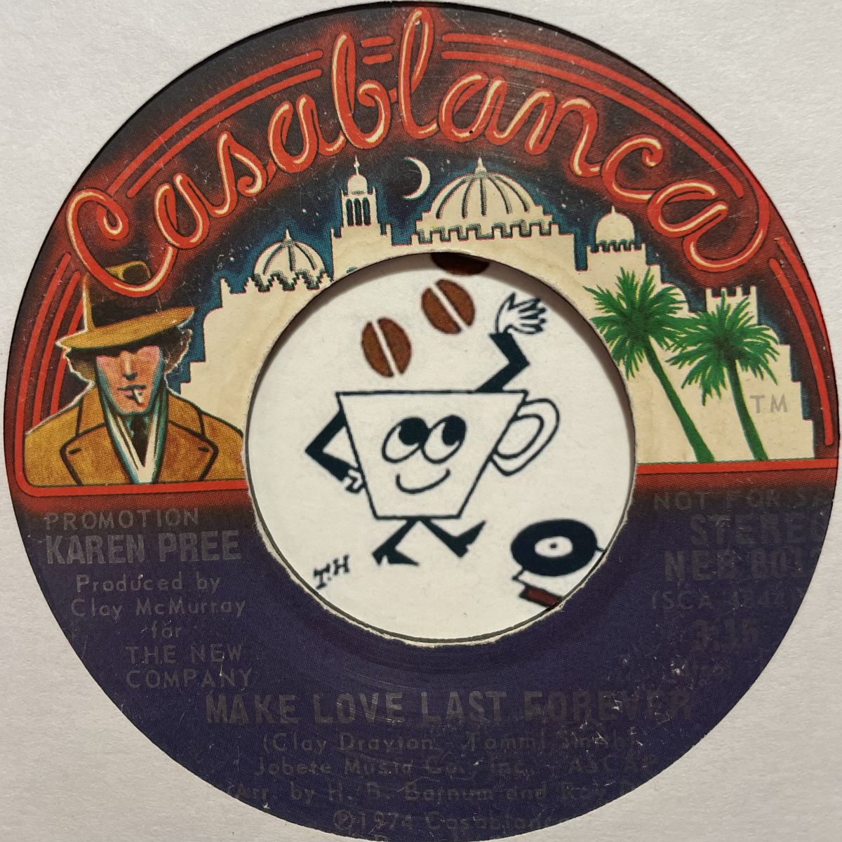 USソウルコーラスグループTHE PREE SISTERSメンバーKAREN PREEの1974年CASABLANCAレーベルソロSEVEN INCシングルMAKE LOVE LAST FOREVER。SISTERS時代もMCA移籍後のアルバムも全くパッとしませんしエサ箱常連のイメージが否めませんがコチラのSEVEN INCオンリー曲MAKE LOVE LAST FOREVERは例外でございますッ。丁度良い跳ね具合、ほんのり甘酸味、キャッチーなサビ、押し付けがましくない高揚感ッ!!!使い放題のヴァイナル仕様STEREO/MONO盤です。