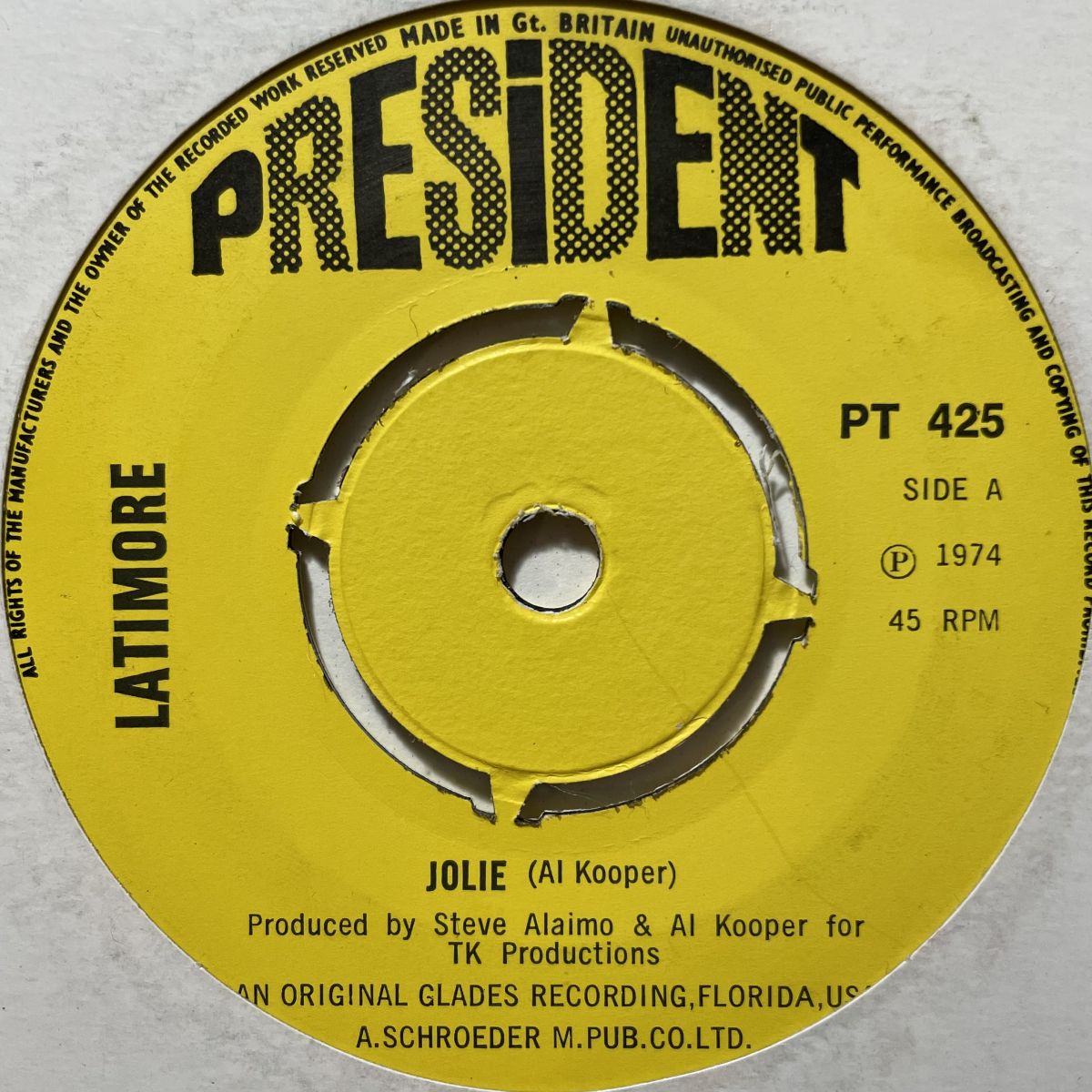 USソウル鍵盤奏者LATIMOREことBENJAMIN LATIMOREのAL KOOPERプロデュース1973年アルバムからJOLIEカバーを抜粋したUK PRESIDENTレーベルリリースSEVEN INCシングル盤。AL KOOPERのオリジナルが空前のSEVEN INCブームで高値高騰大人気でござますが、JOLIEカバーはLATIMOREでしょッって皆さまも多いハズです。ワタクシはオリジナルもDAWNもLATIMOREも好きなので全てSEVEN INCシングルで必携だと思います!!!!!